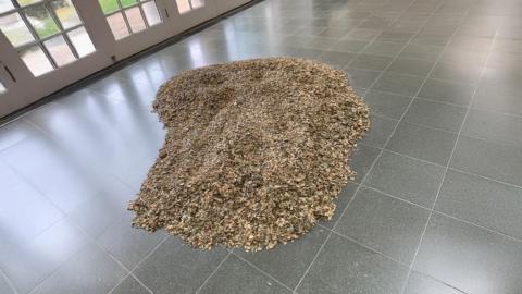 Fig. 7: Otobong Nkanga, Confluence - Afterglow, 2024. Ceramic, wood ash. 153 x 200 x 200 cm. Installation view at Lisson Gallery London.