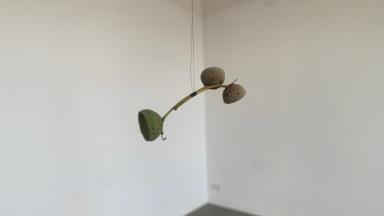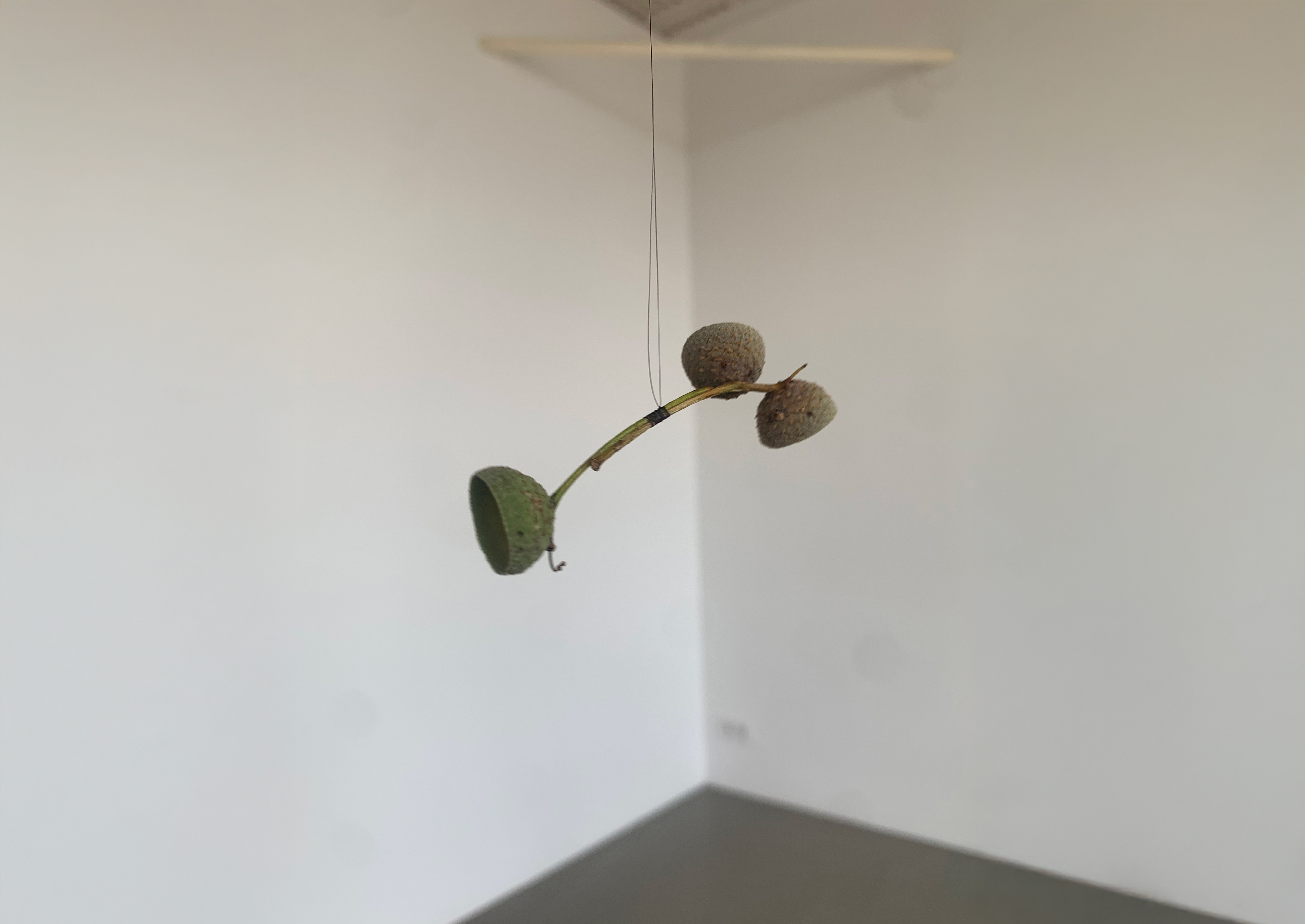1. Rita Veres, ASexual Juggling Identities, 2025. Miniature, hanging sculpture assemblage. Acorns, strand of own hair. 5 x 1.5 cm. Shown at Fahrbereitschaft Haubrok, Berlin.