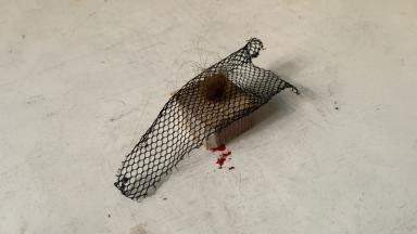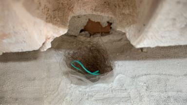 4. Rita Veres, Nest, 2025. Miniature sculpture assemblage. Own collected hair from my hairbrush, rubber band, cigarette cellophane. 10 x 10 x 2.5 cm. Shown inside of a WWII bullet hole at Former Courthouse Lehrter StraBe, Berlin.