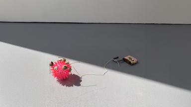 3. Rita Veres, The things we leave behind, 2025. Miniature sculpture assemblage. Rusted-broken lock, sticker, cotton string, plastic toy, acorns, shells, light&shadow. Dimensions variable. Shown at Facher Gallery, Berlin.