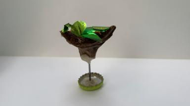 5. Rita Veres, Ephemeral Chalice (cup of life), 2025. Miniature sculpture assemblage. Beer bottle cap, nail, chewing gum, wood chip, artificial flower. 15 x 10 x 5 cm. Shown at Generator Berlin Mitte.