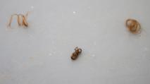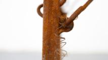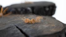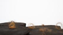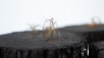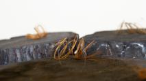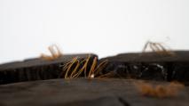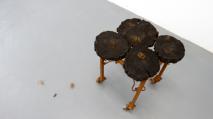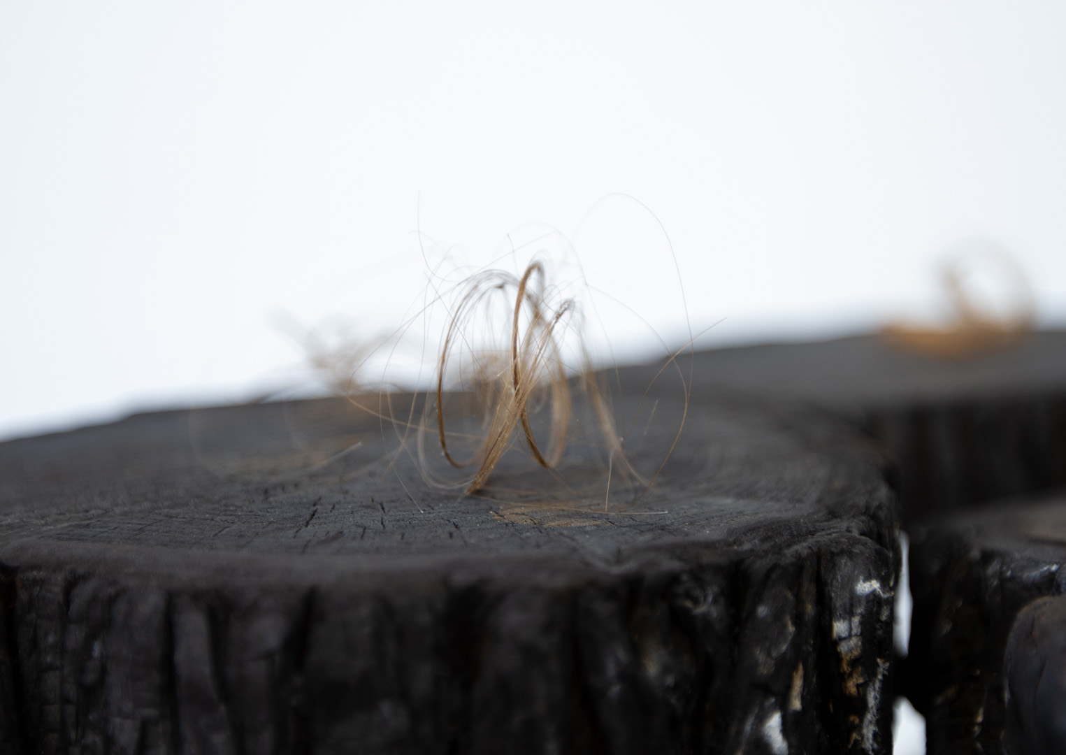 Collection of own hair, horsehair, hairspray, rusted mild steel, castor wheels, charred pine wood. Dimensions variable.