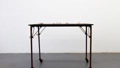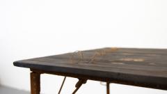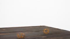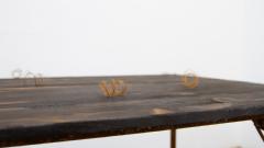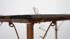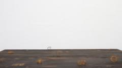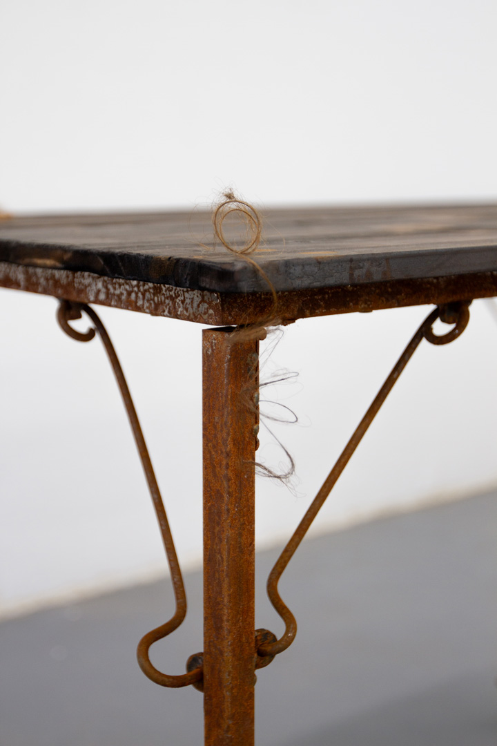 Collection of own hair, horsehair, hairspray, rusted mild steel, castor wheels, charred pine wood. Dimensions variable.