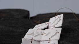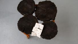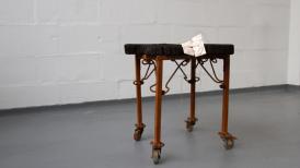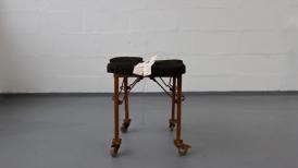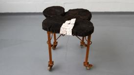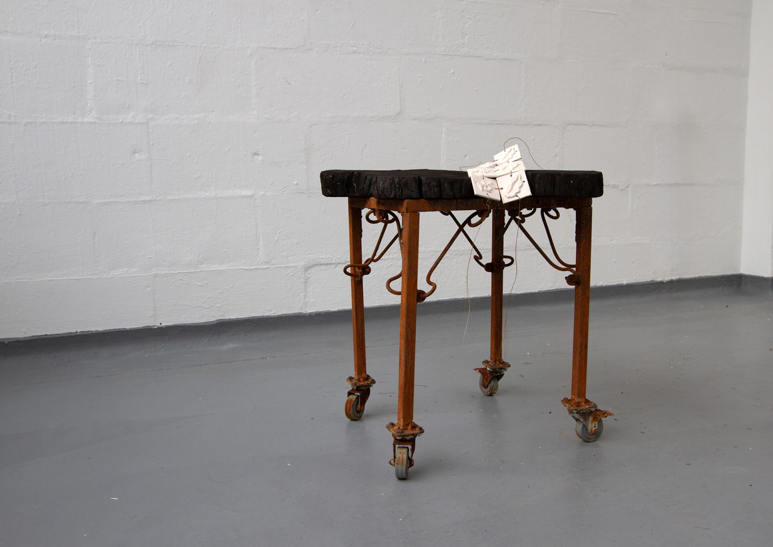 White stoneware clay, braided horsehair, charred pine, rusted mild-steel, castor wheels.