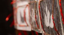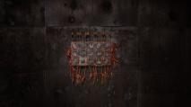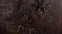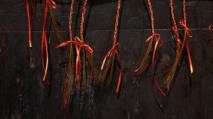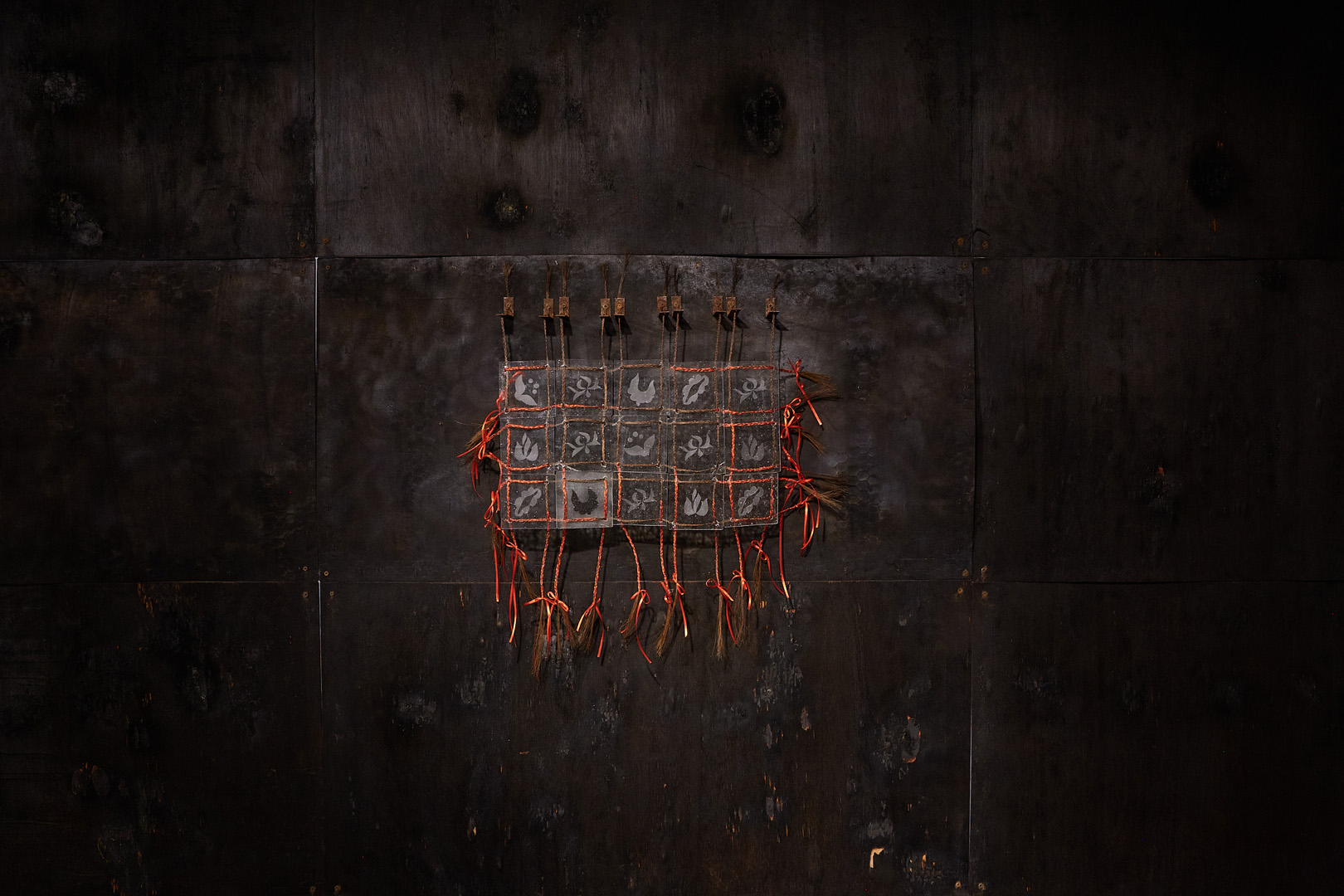 Charred pine wood, etched glass, Transylvanian horse hair, red-satin ribbons, rusted mild steel. Wall mounted installation. 240 x 350 cm
